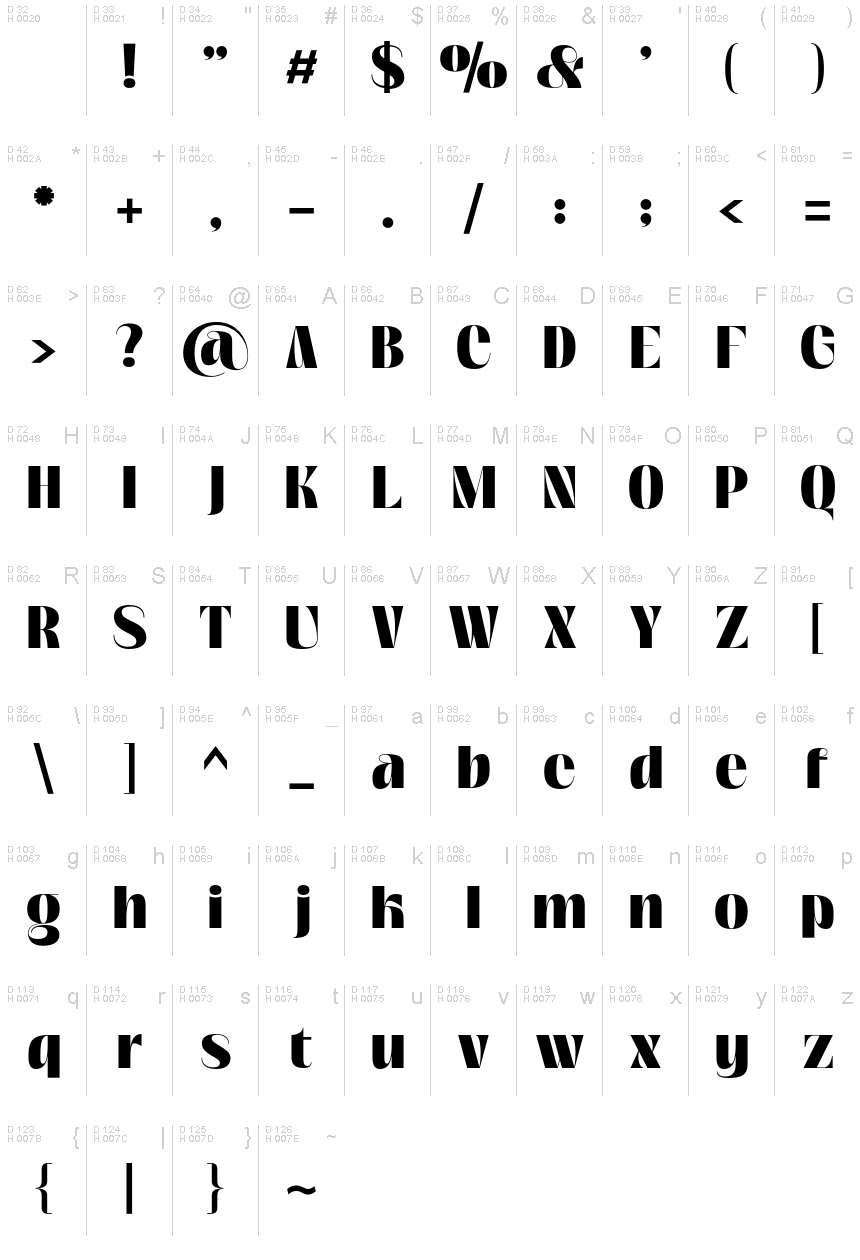 Benutzen Sie bitte das Pull-Down Menü um verschiedene Zeichentabellen, die in dieser Schriftart enthalten sind, zu sehen.